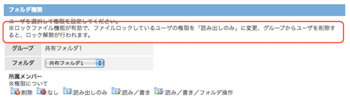 ロックを行ったユーザのフォルダ権限を「読み出しのみ」に変更、グループからユーザを削除すると、ファイルのロック解除が行われます。